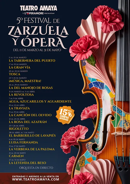 Nuestra programación combina la universalidad de la ópera (Carmen, La Traviata, Tosca, Rigoletto) con la riqueza y la tradición de nuestra zarzuela (La Tabernera del Puerto, La Verbena de la Paloma, La Leyenda del Beso). Un equilibrio perfecto que atrae tanto al público experto como a nuevas audiencias, garantizando el éxito de taquilla y crítica.